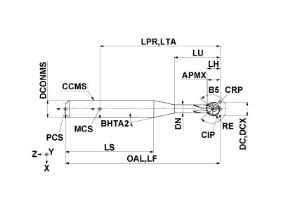 Multi-function ball end mill with a lollipop shape for 5-axis machining.
